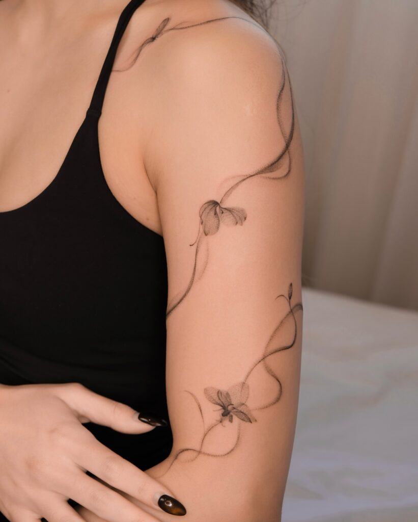 The thin, delicate outlines emphasize simplicity, while the subtle shading adds a natural softness to the design. Placed on the arm, it flows effortlessly with the body’s curves, creating a refined and feminine look.