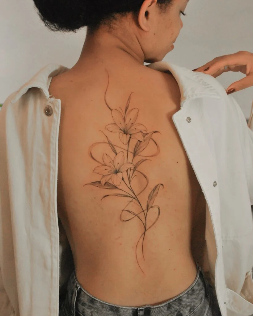This tattoo features elegant lilies flowing down the back, designed with graceful fine lines and soft shading.
