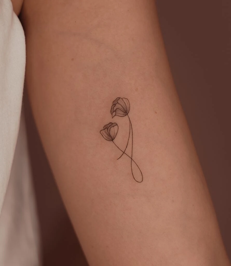 Poppies often symbolize remembrance, peace, and resilience, making this tattoo meaningful as well as visually refined. Its placement on the arm allows it to flow naturally with the body, creating a timeless and feminine floral design.