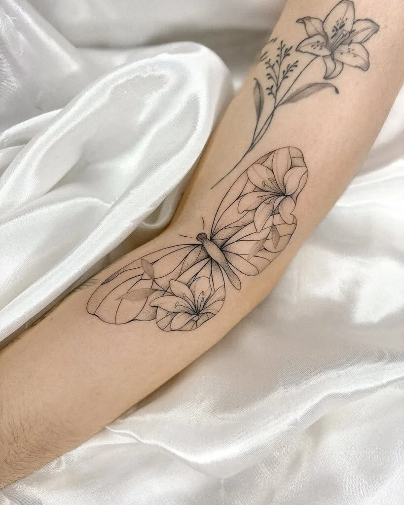 The placement enhances the arm’s natural lines while remaining elegant and versatile. Symbolizing transformation, beauty, and freedom, this tattoo is a perfect choice for women who love meaningful and ethereal body art.