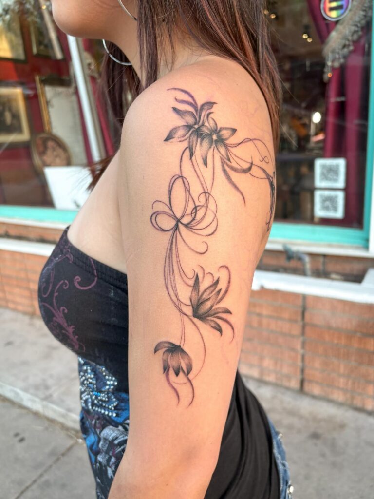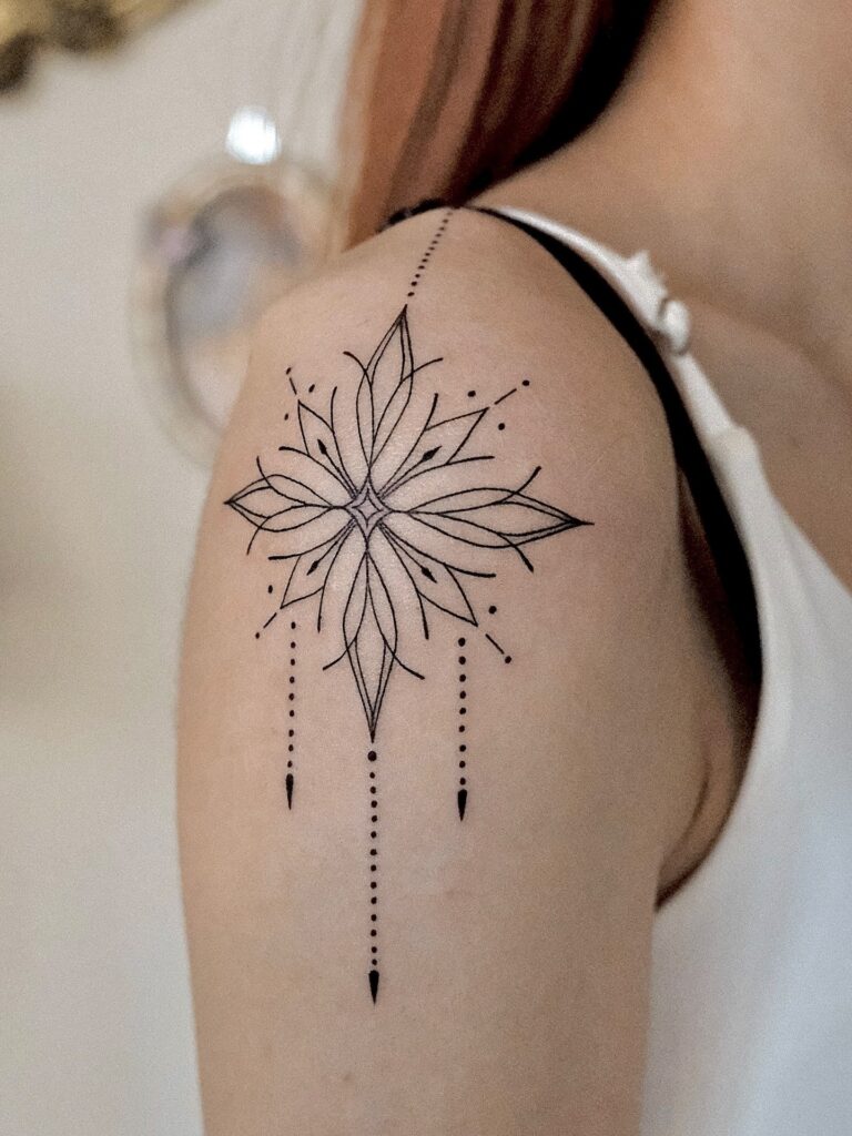 Swirling lines extend outward, adding movement and charm to the design. Positioned gracefully on the shoulder, it enhances the body’s curves while maintaining a feminine touch.