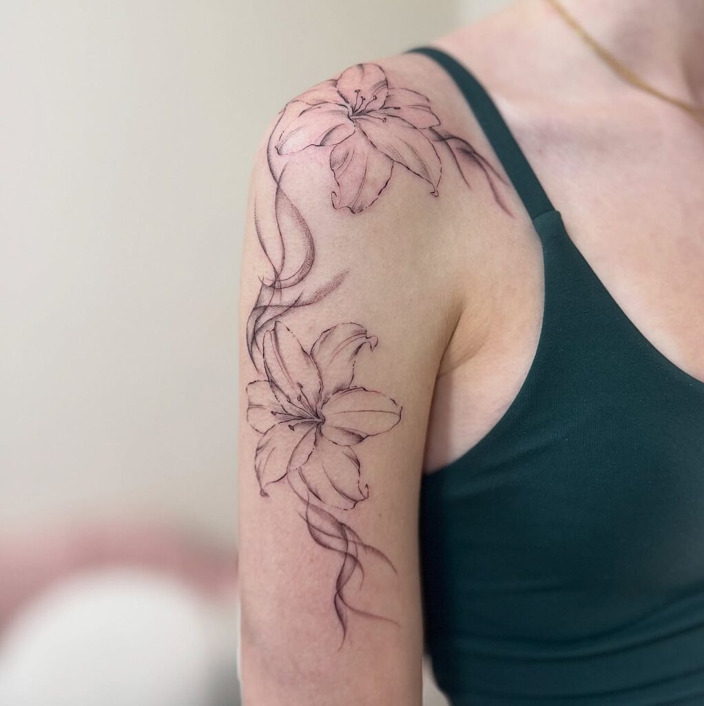 This fine line tattoo features two beautifully detailed lilies, one placed on the shoulder and the other on the upper arm. Soft shading enhances the petals, giving them a natural depth and elegant texture.
