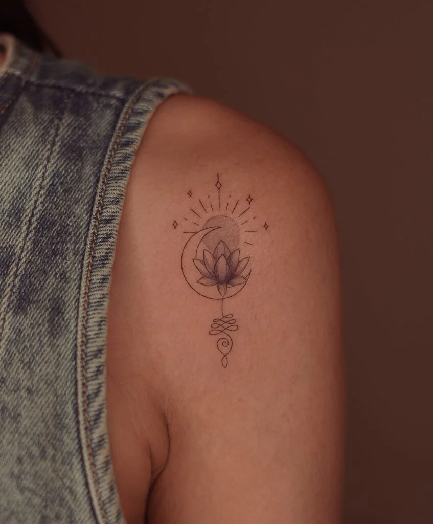 The lotus sits above the moon, symbolizing spiritual growth and purity, while rays and dotted details radiate outward. Its placement on the shoulder enhances the natural shape of the body, giving the piece balance and flow.