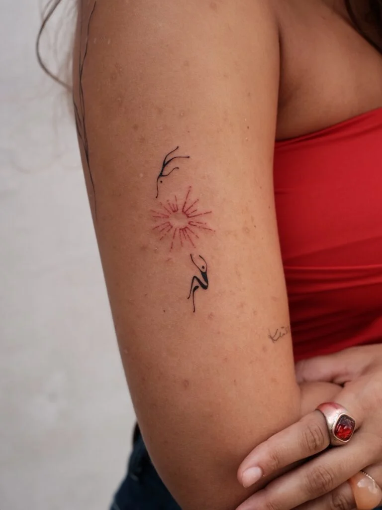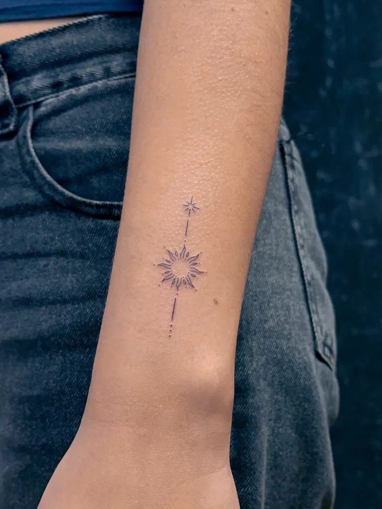 Together, they form a balanced tattoo with deep symbolic meaning. Placed on the arm, it’s discreet yet eye-catching, perfect for women who love simple, meaningful celestial tattoos that carry personal strength and beauty.