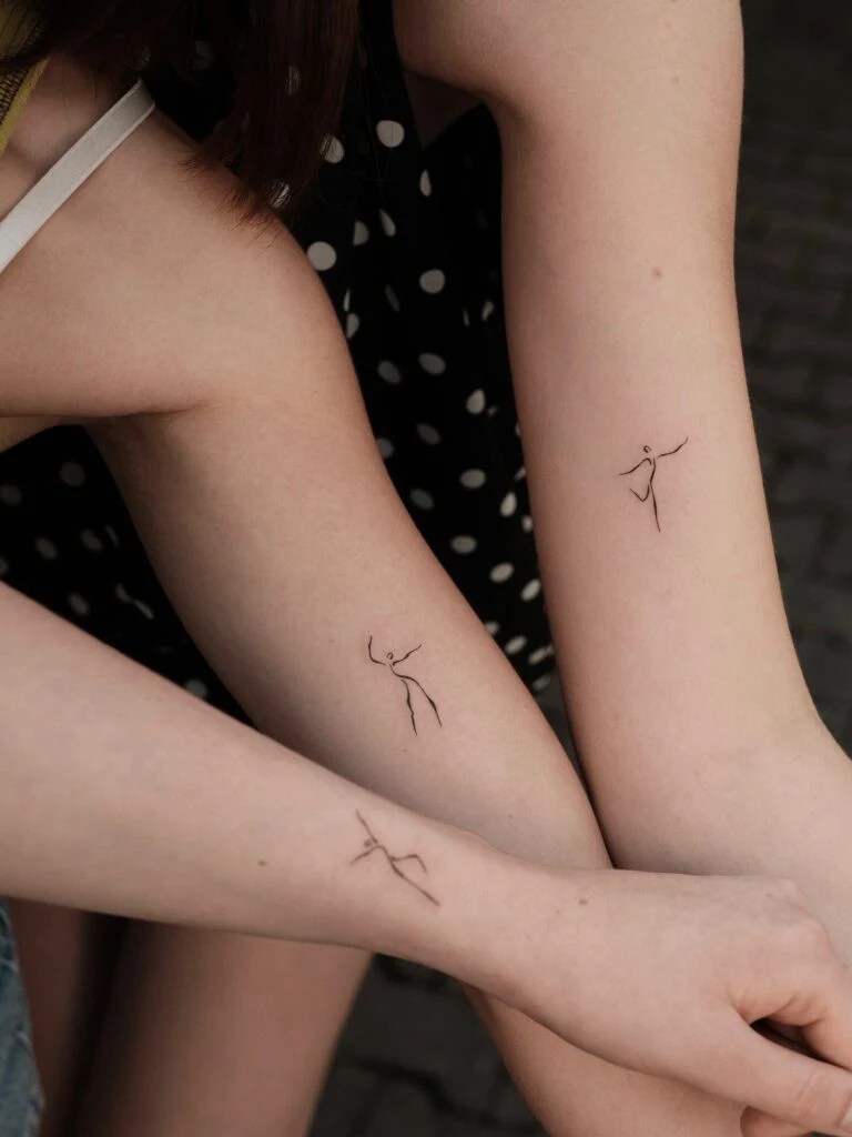 These tattoos feature elegant fine line figures of dancers, drawn with minimal strokes to capture graceful movement.