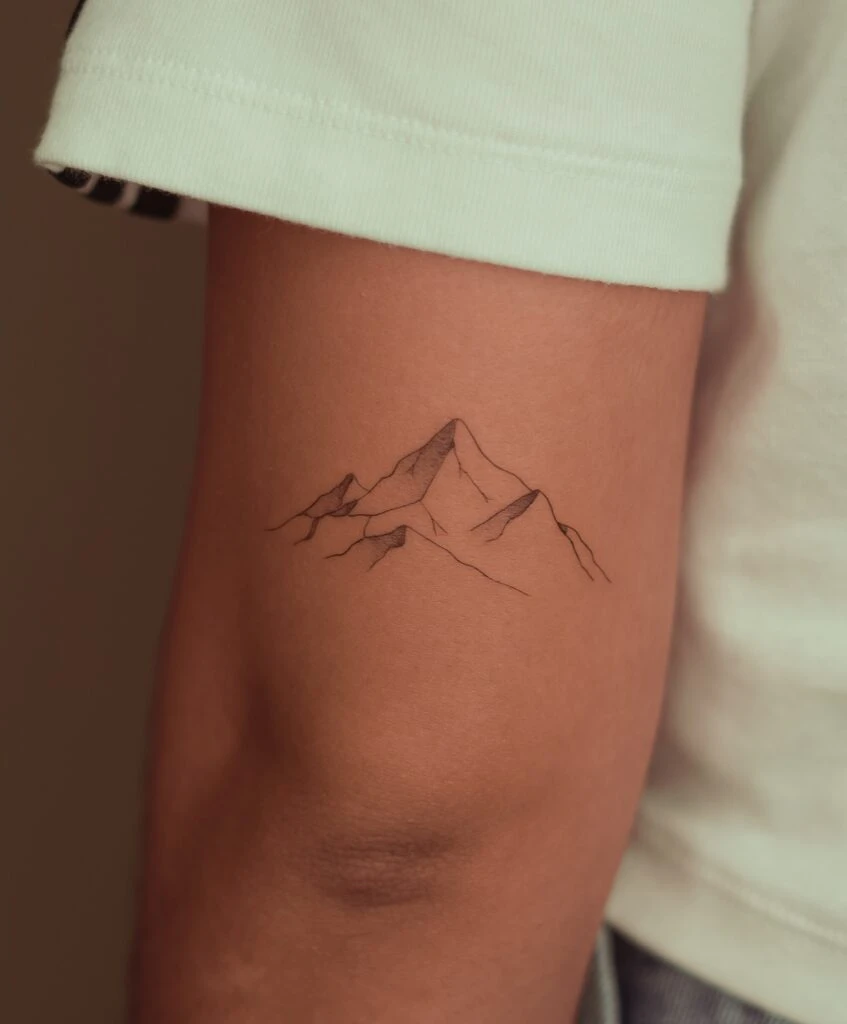 This tattoo features a simple mountain outline inked on the arm, drawn with sharp yet delicate fine lines.