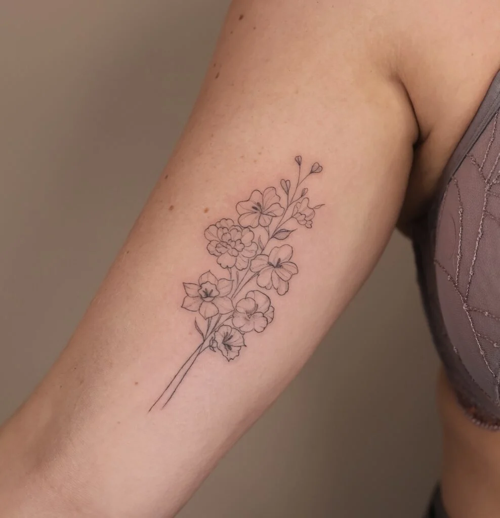 The fine line style emphasizes lightness and elegance, making the design feel airy and natural. The placement enhances the arm’s shape, allowing the stems to move fluidly across the skin.