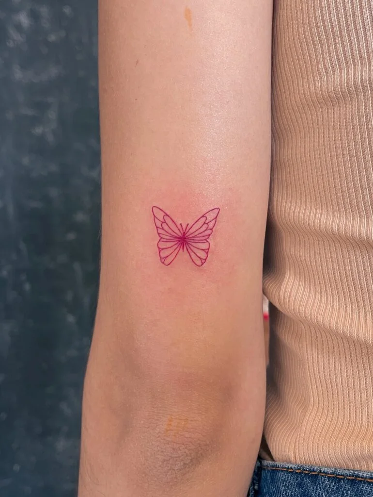 This tattoo features a vibrant pink butterfly, delicately outlined with fine lines for a soft yet striking effect.