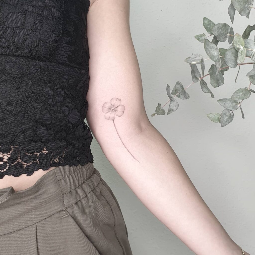 Its long, thin stem enhances the design’s elegance, while the subtle details give each leaf a natural feel. Placed on the arm, it stands out as a minimalist yet symbolic piece. The four-leaf clover is universally known as a sign of luck, hope, and positivity.