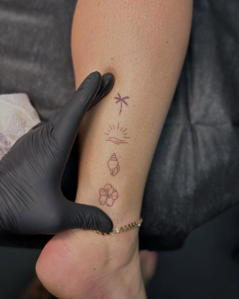 Each element is drawn with simple outlines, creating a cohesive design that feels light and relaxed. Placed on the ankle, the tattoo carries a playful yet stylish appeal, perfect for showing off in summer.