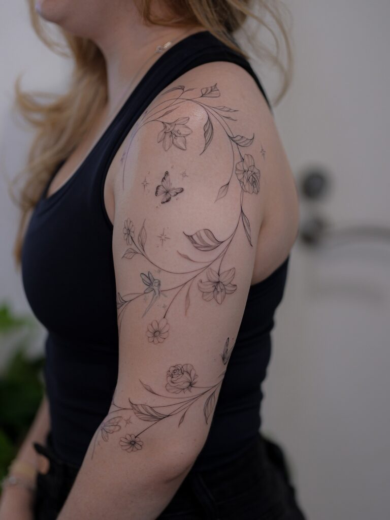 This fine line tattoo creates a dreamy sleeve design with flowing flowers, delicate leaves, and fluttering butterflies.