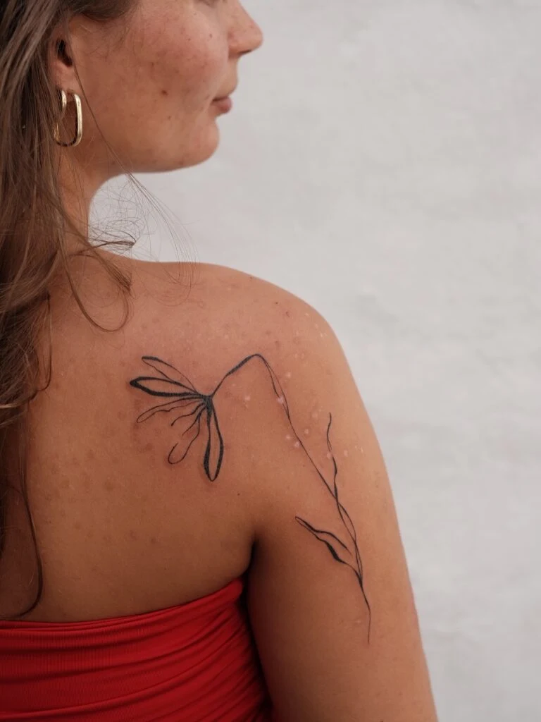This fine line tattoo features a delicate flower placed gracefully on the shoulder, flowing seamlessly into soft trailing lines.