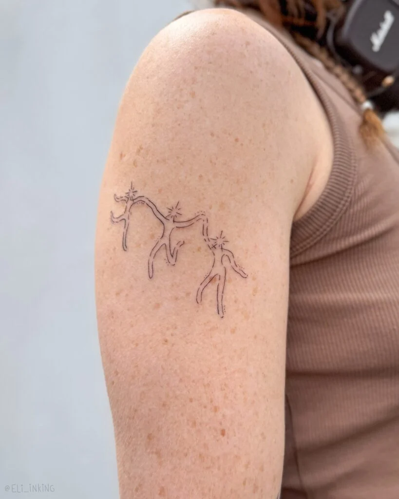This tattoo features whimsical human-like figures drawn in fine lines, connected with sparkling star details above them.