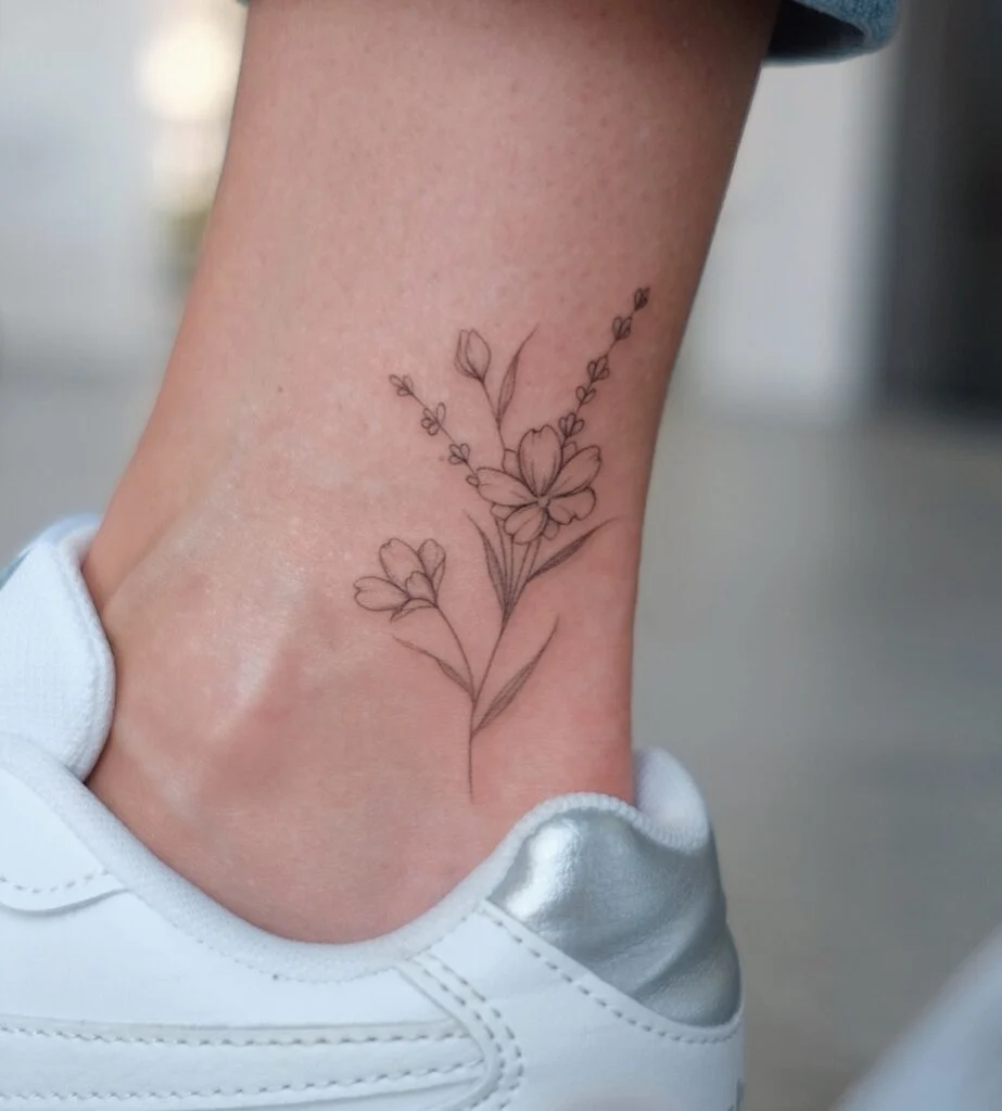 This fine line tattoo features a charming arrangement of small flowers and leaves, elegantly placed on the ankle.