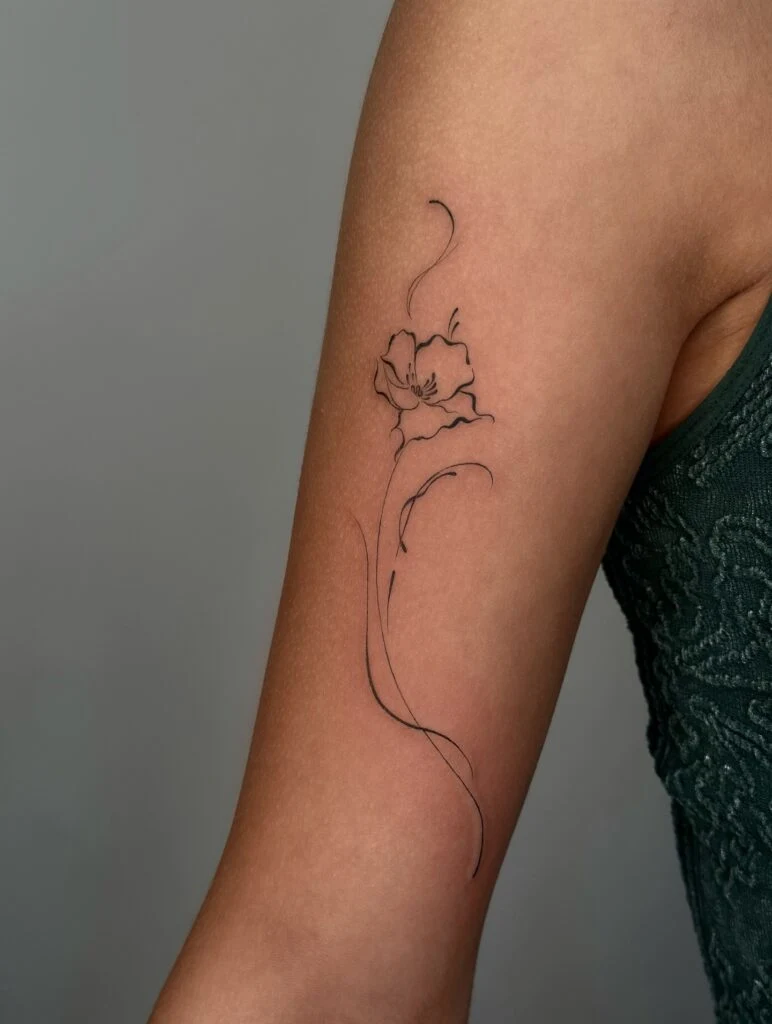 This fine line tattoo features a single poppy with flowing stems, giving the design an elegant and airy appearance.