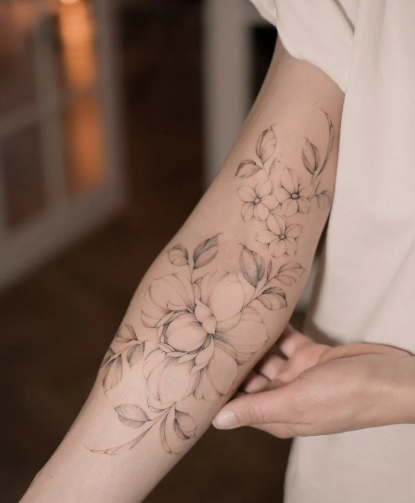This fine line tattoo transforms the arm into a vibrant floral canvas, blending delicate outlines with bold shading.