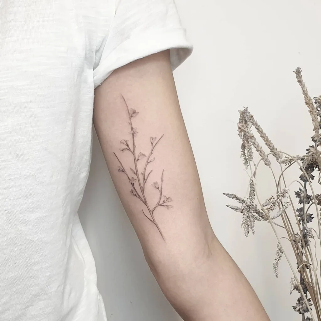 The fine line style emphasizes lightness and elegance, making the design feel airy and natural. The placement enhances the arm’s shape, allowing the stems to move fluidly across the skin.