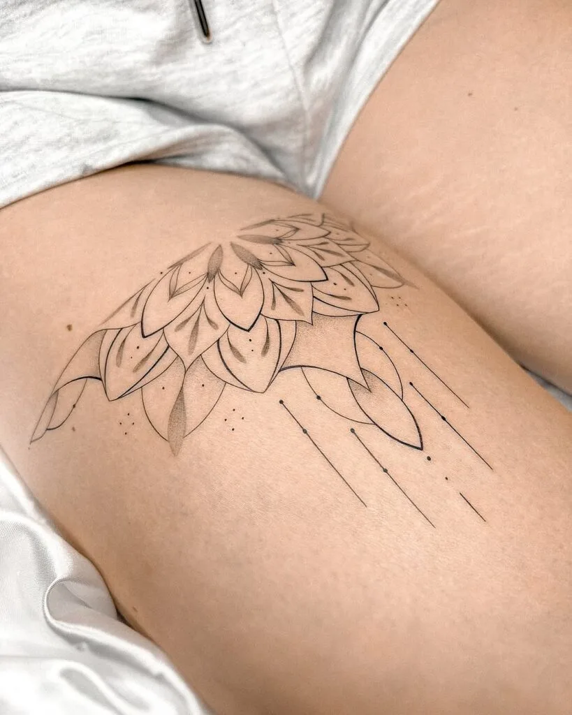 The petals are softly shaded for depth, while precise lines and dots extend outward, adding symmetry and flow. Placed on the thigh, the design enhances the body’s curves while remaining bold and elegant.