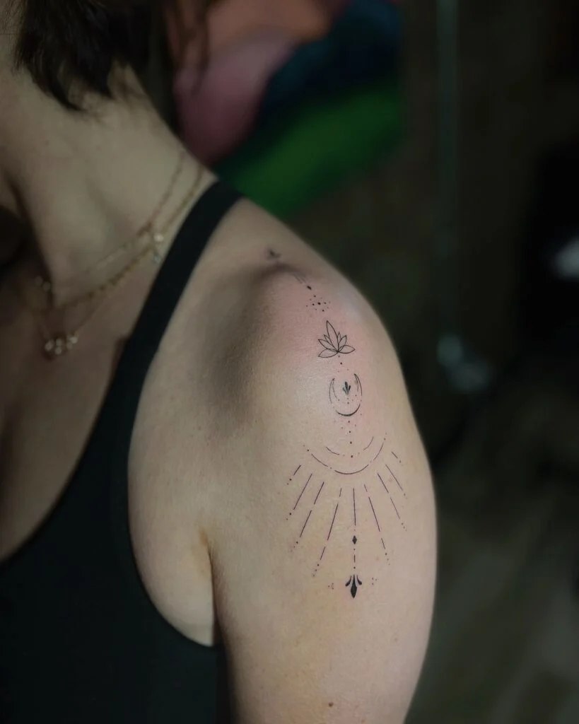 The lotus sits above the moon, symbolizing spiritual growth and purity, while rays and dotted details radiate outward. Its placement on the shoulder enhances the natural shape of the body, giving the piece balance and flow.