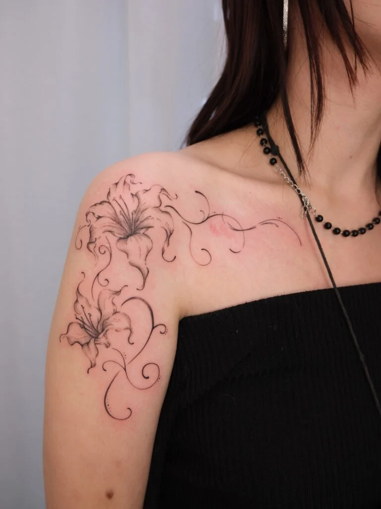 This fine line tattoo features two beautifully detailed lilies, one placed on the shoulder and the other on the upper arm. Soft shading enhances the petals, giving them a natural depth and elegant texture.