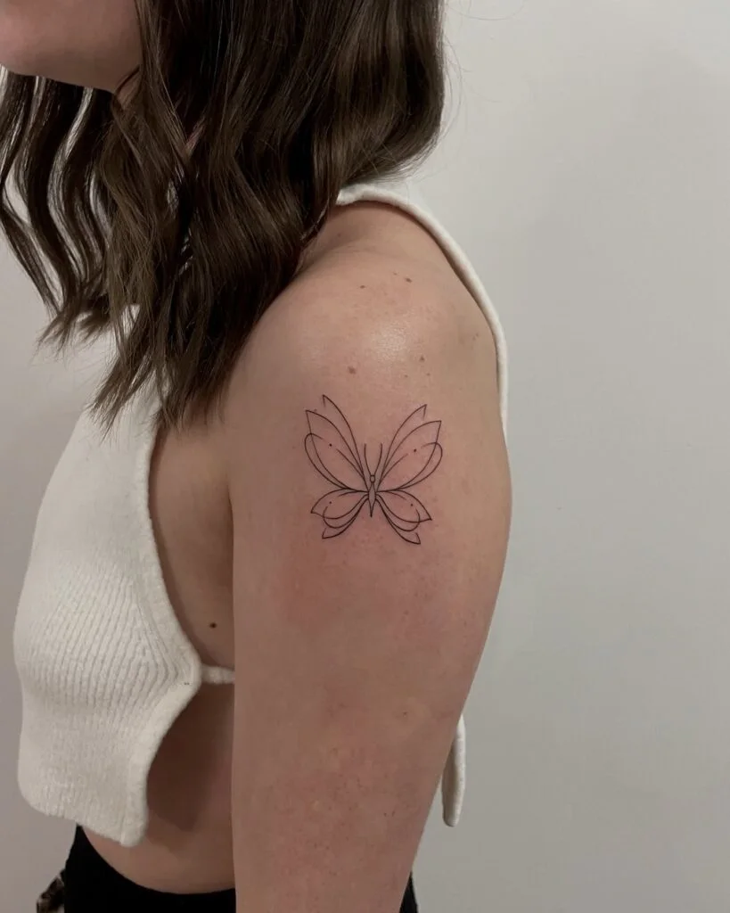 This fine line tattoo features a simple yet elegant butterfly design placed on the upper arm. Clean outlines shape the delicate wings, with subtle line details adding symmetry and balance.