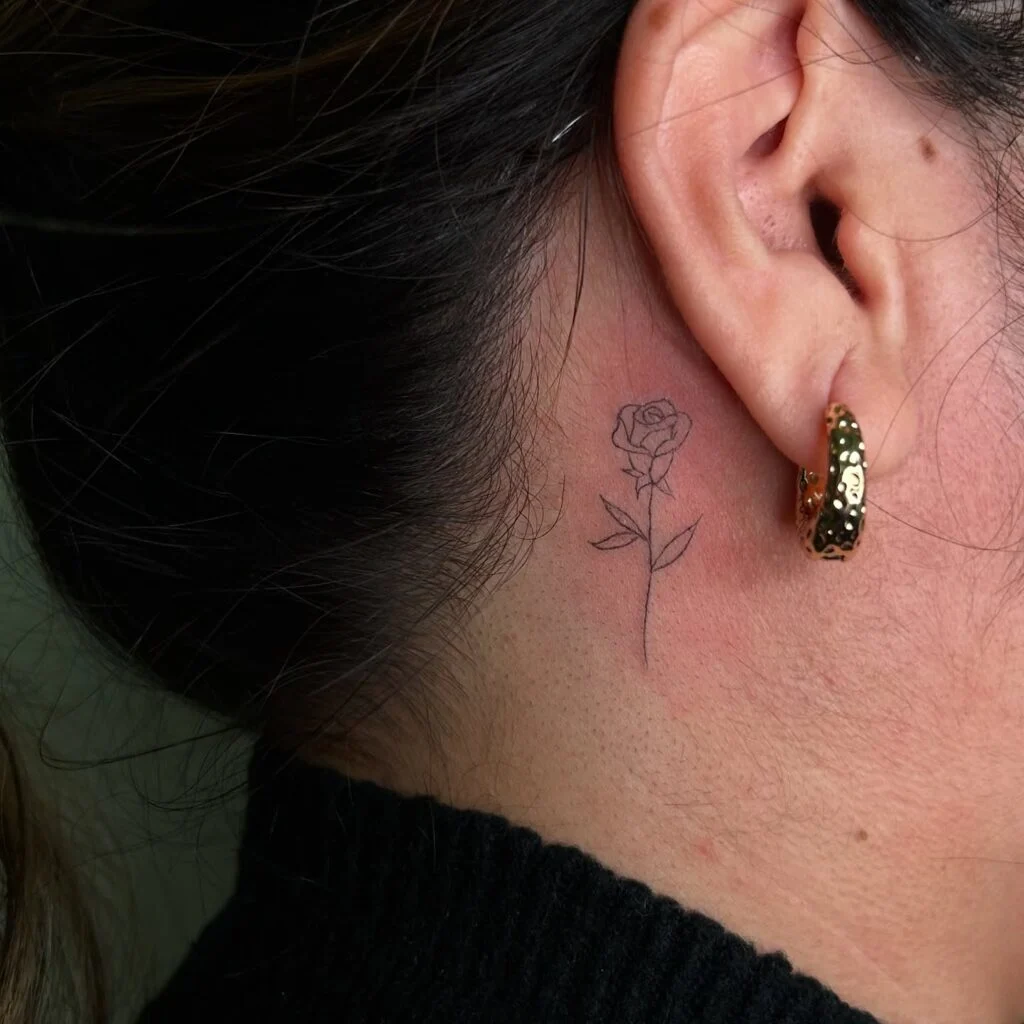 This fine line tattoo features a small, elegant rose placed delicately behind the ear. The thin outlines keep the design subtle, while the tiny petals and leaves add just enough detail to make it stand out.