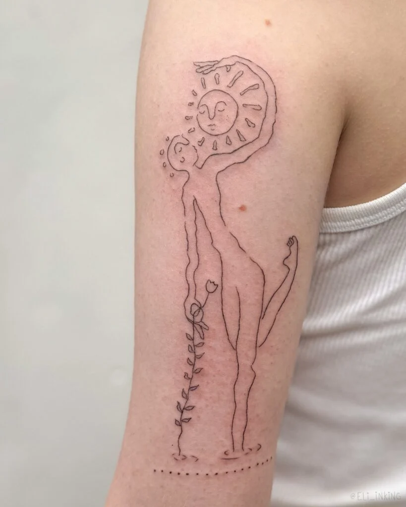 Together, they form a balanced tattoo with deep symbolic meaning. Placed on the arm, it’s discreet yet eye-catching, perfect for women who love simple, meaningful celestial tattoos that carry personal strength and beauty.