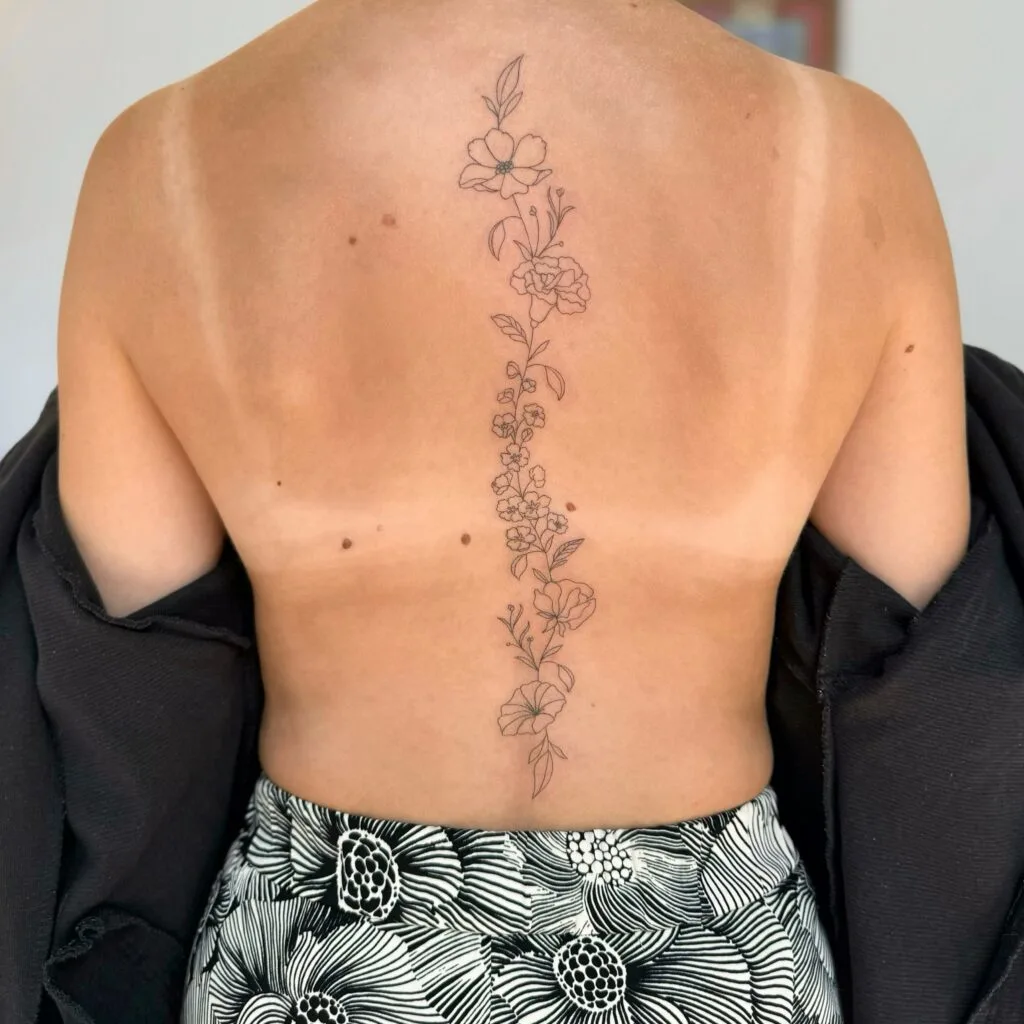 This fine line tattoo showcases a vertical arrangement of delicate flowers running gracefully along the spine.