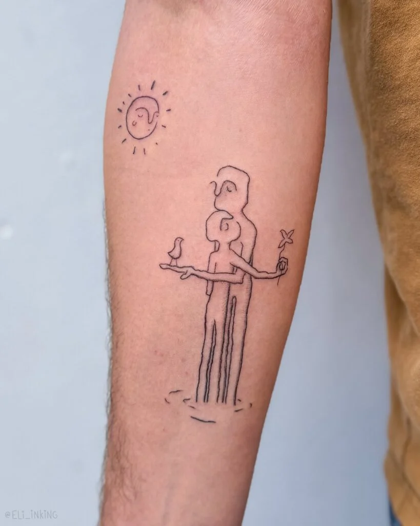 Placed on the forearm, it becomes a striking piece that balances subtlety with strong visual impact. This design celebrates love, identity, and human connection through minimalism, proving that even the simplest lines can carry profound meaning.