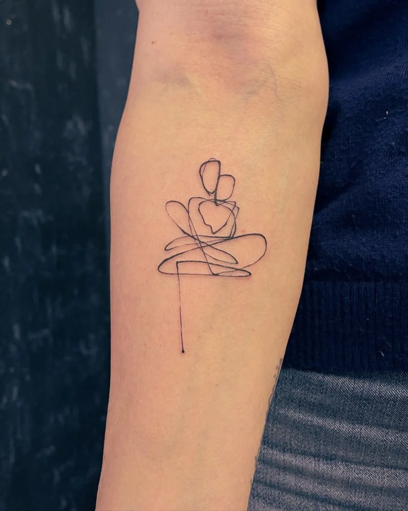 This fine line tattoo uses abstract, continuous strokes to create the image of a parent cradling a child.