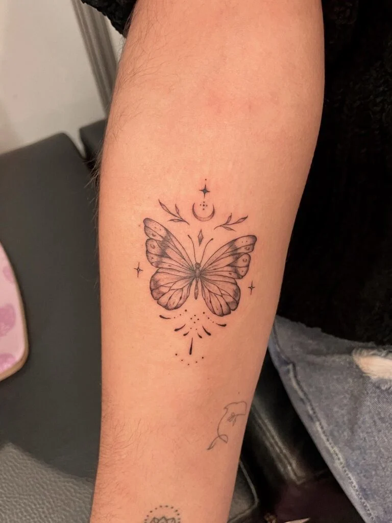 The butterfly, often a symbol of transformation, freedom, and resilience, feels ethereal and light in this design. The radiating lines create a sense of energy and motion, as if the butterfly is glowing with life. Subtle dotwork enhances the composition, adding balance and elegance.