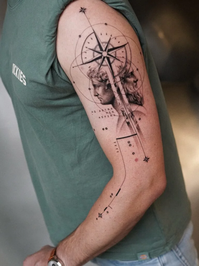 This striking tattoo blends classical and cosmic themes, featuring two overlapping faces framed beneath a large compass rose.