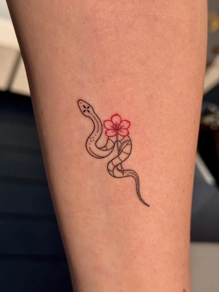 This tattoo features a sleek snake wrapped gracefully around a vibrant cherry blossom, blending elegance with symbolism.