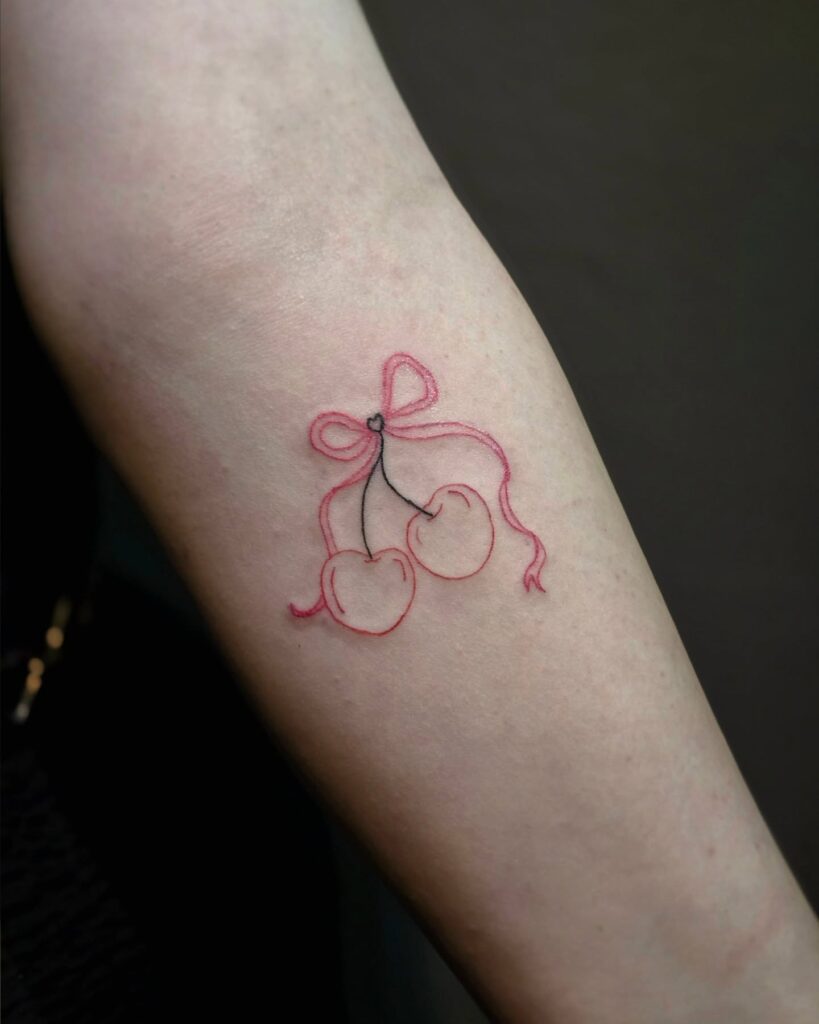 This fine line tattoo features two cherries outlined in red, tied together with a delicate bow at the stems.