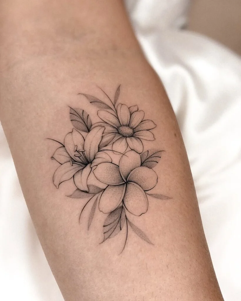 This fine line tattoo showcases a beautifully arranged bouquet featuring plumeria, daisy, and lily flowers. Each bloom is drawn with soft shading and precise details, creating a realistic yet graceful design.
