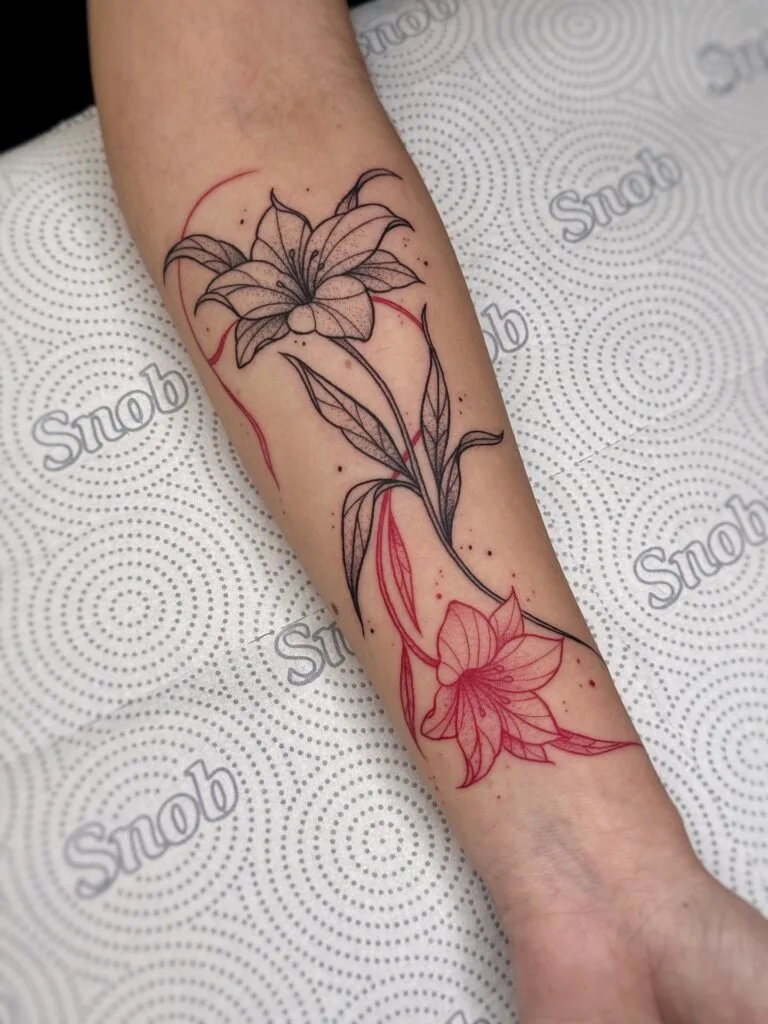 One lily flows upward while the other faces downward, creating natural balance and harmony across the forearm. Red ink accents surround and highlight the flowers, adding contrast and emotional intensity to the design.