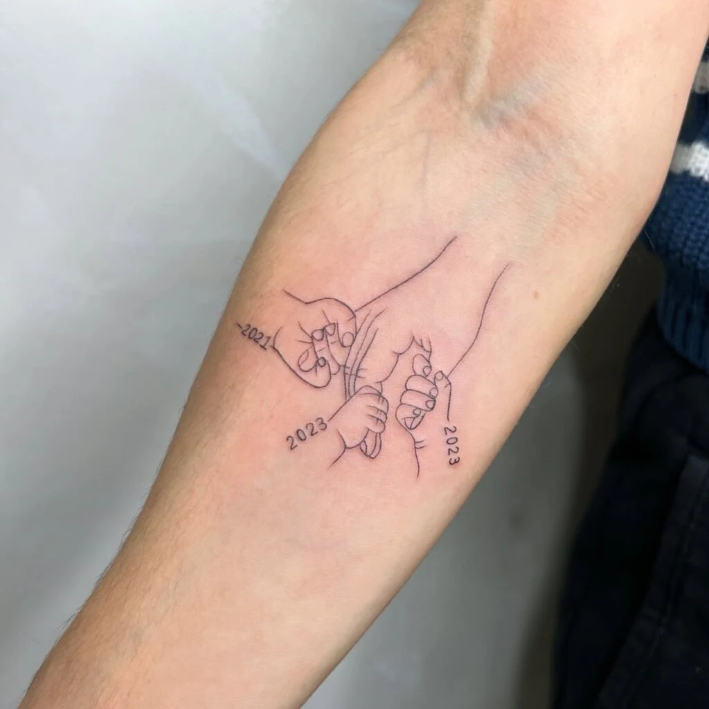 This touching tattoo shows a parent’s hand being held by two small children’s hands, each marked with their birth years.