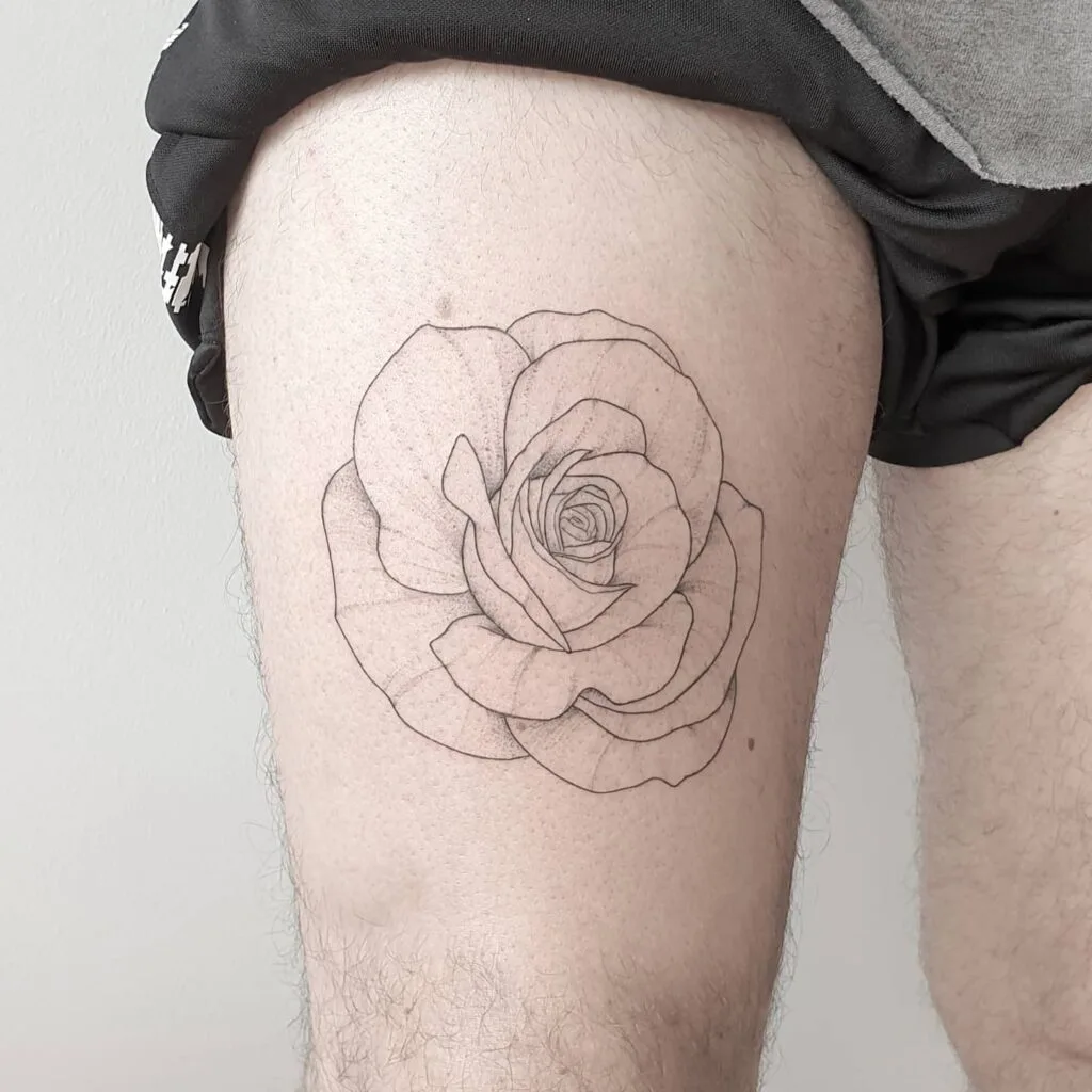 Fine Line Rose Thigh Tattoo