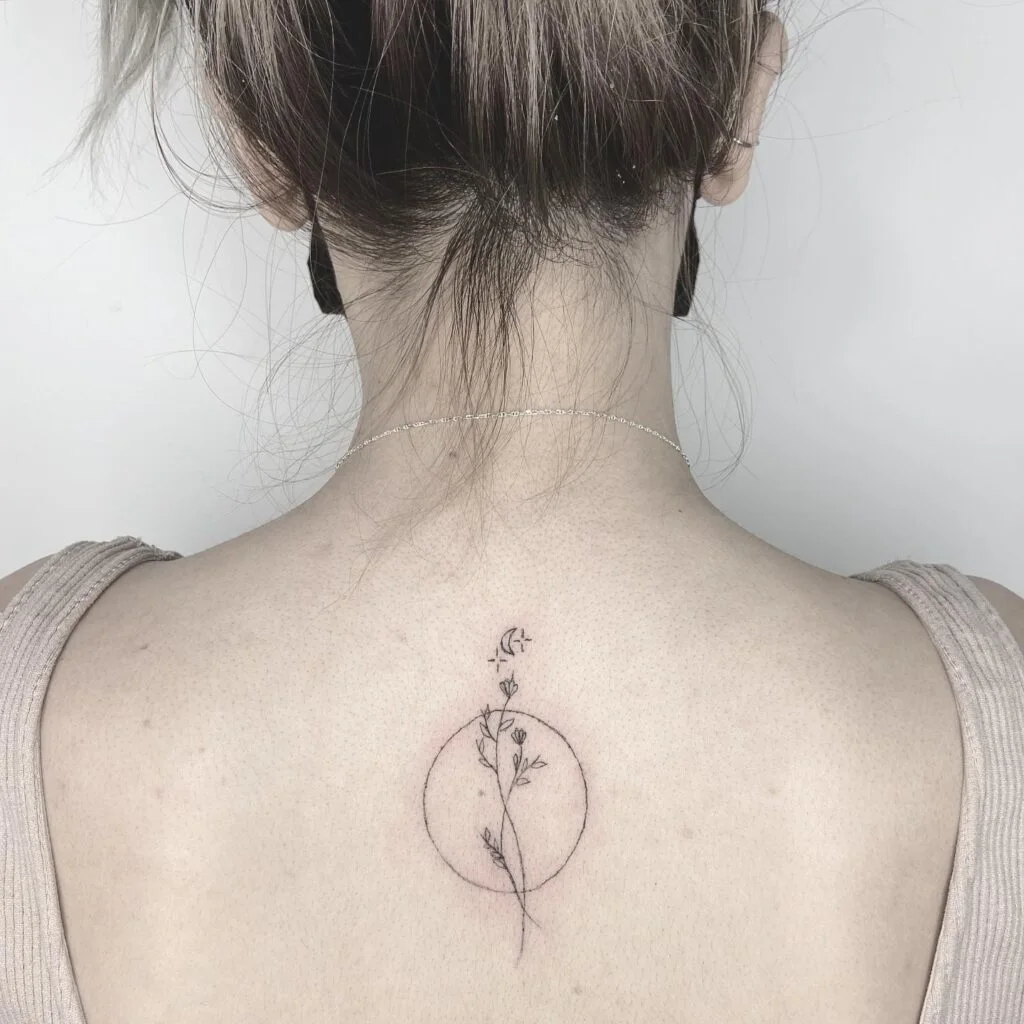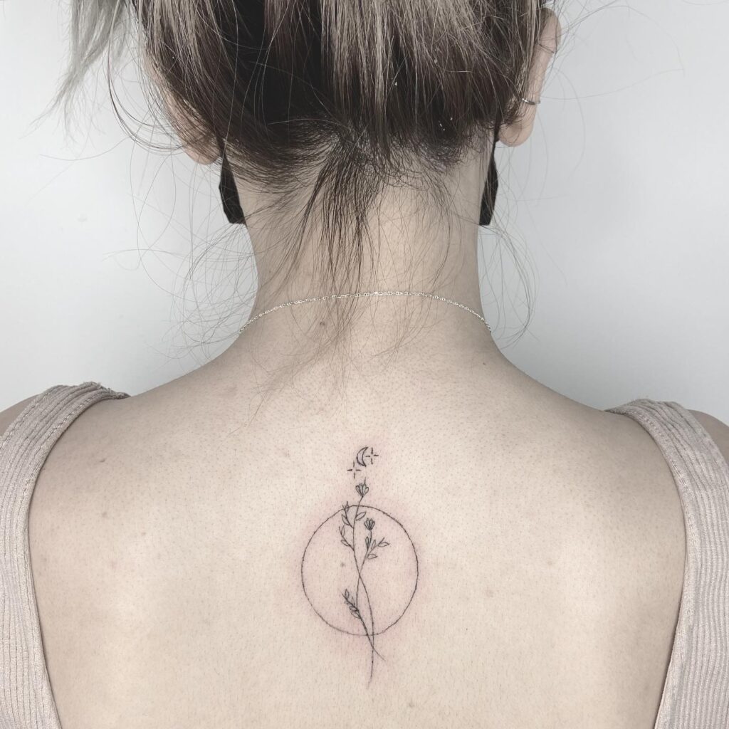 Above the circle, a crescent moon and tiny stars add celestial charm, blending nature with cosmic energy. The flower’s thin, graceful lines emphasize elegance and growth, while the minimal shading keeps the design subtle.