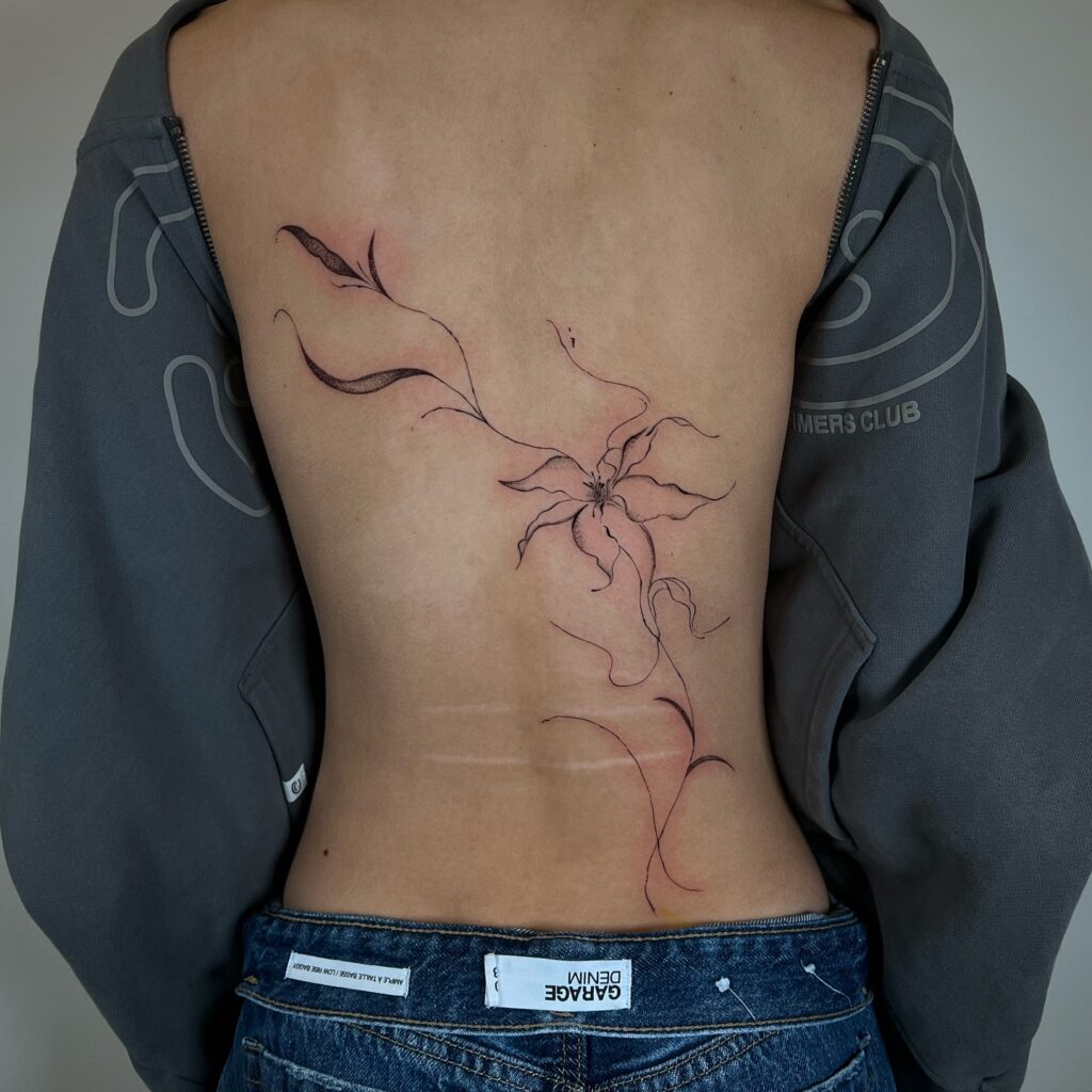 This fine line tattoo features a large, abstract flower at the center of the back, with petals extending gracefully outward.