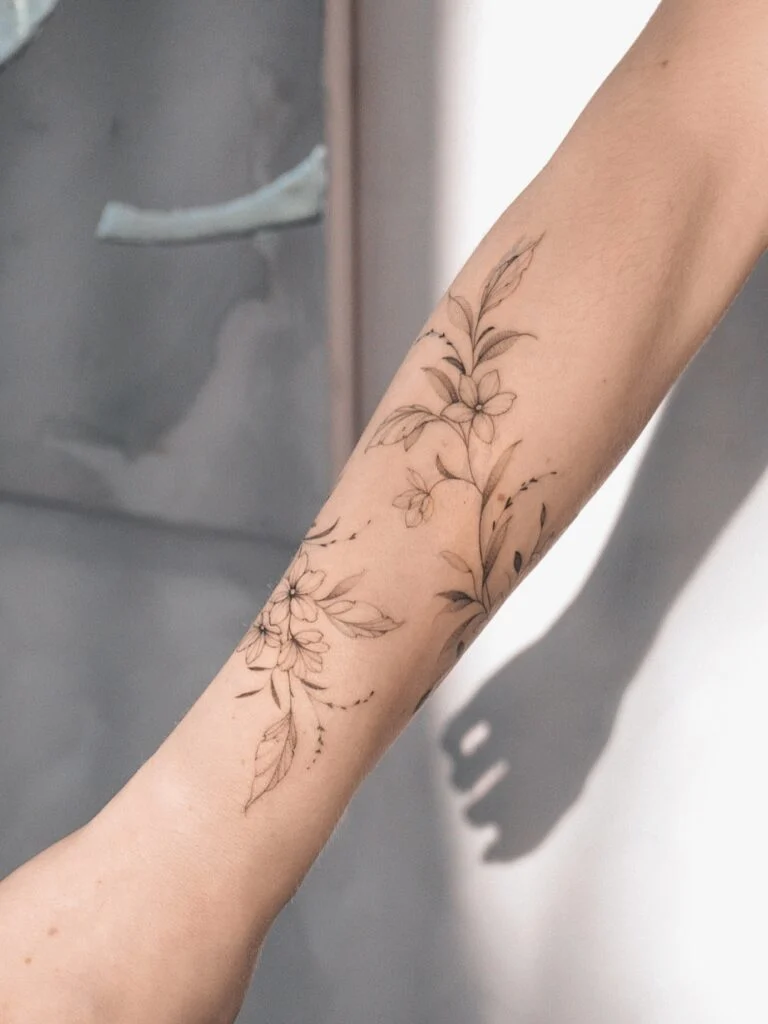This fine line tattoo beautifully wraps around the forearm, featuring delicate flowers and softly curving leaves.