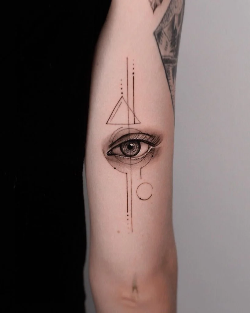 This tattoo features a hyper-detailed eye at the center, surrounded by minimalist geometric lines and shapes.