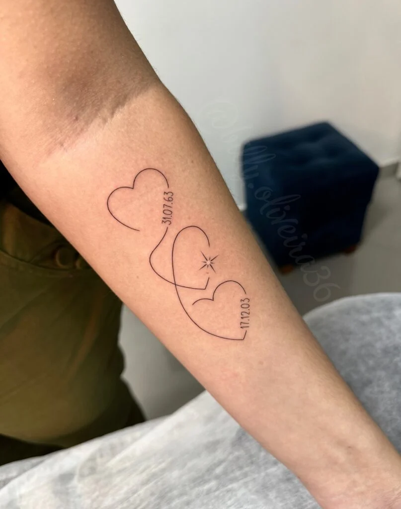 The clean, minimal lines keep the tattoo elegant while highlighting its emotional significance. This piece beautifully combines simplicity with personal storytelling, creating a timeless design that honors love, family, or unforgettable milestones.