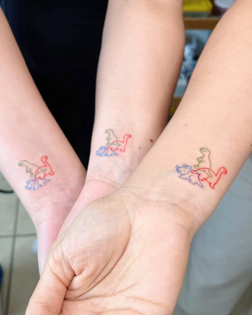 Each tattoo combines a red dinosaur with a green one above and a blue one below, creating a vibrant trio. The simple yet charming style gives the design a lighthearted, cartoon-like appeal. Perfect for friends or siblings, these tattoos symbolize shared memories, childhood nostalgia, and unbreakable bonds.