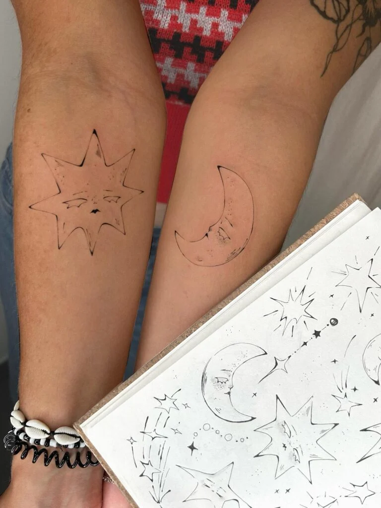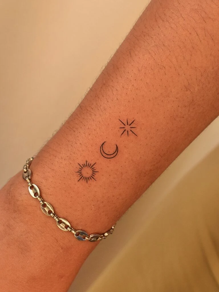 Placed on the forearm, it creates a small yet meaningful piece that’s easy to show or keep subtle. This tattoo is perfect for someone drawn to celestial themes and seeking a timeless design with layered symbolism.