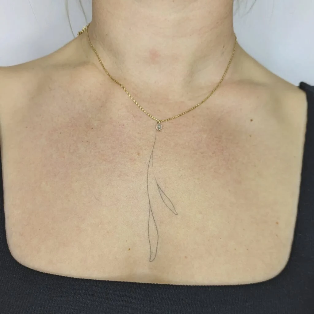 This fine line tattoo features a simple branch with two delicate leaves, placed just below the collarbone. Its minimal design emphasizes elegance and subtlety, blending naturally with the body’s curves.