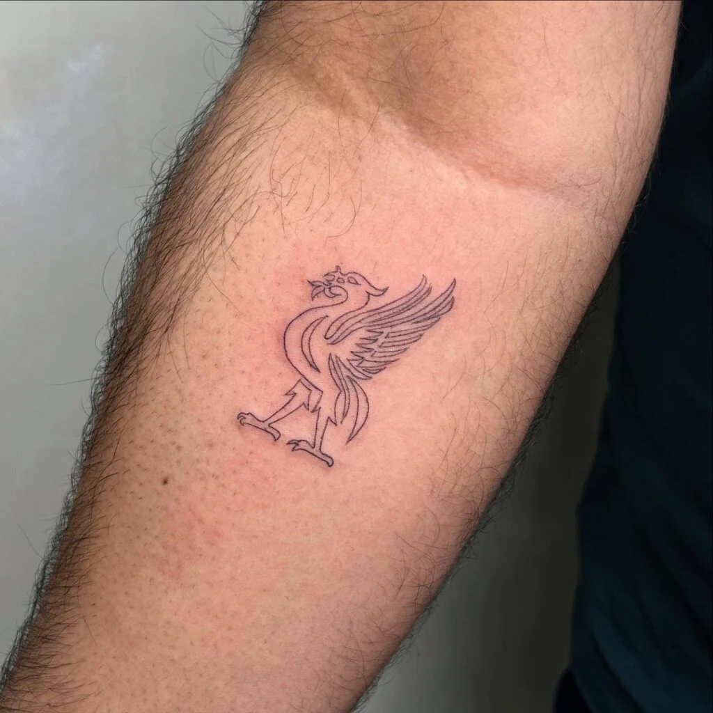 This fine line tattoo showcases the iconic Liverbird, a timeless symbol of Liverpool and its football heritage.