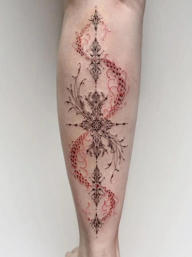 This tattoo blends intricate ornamental patterns with flowing red accents, creating a striking and balanced design.