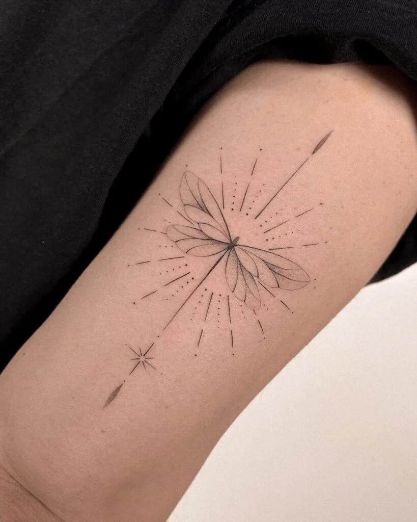 This fine line tattoo depicts a delicate butterfly framed by radiant beams and dotted details extending outward.