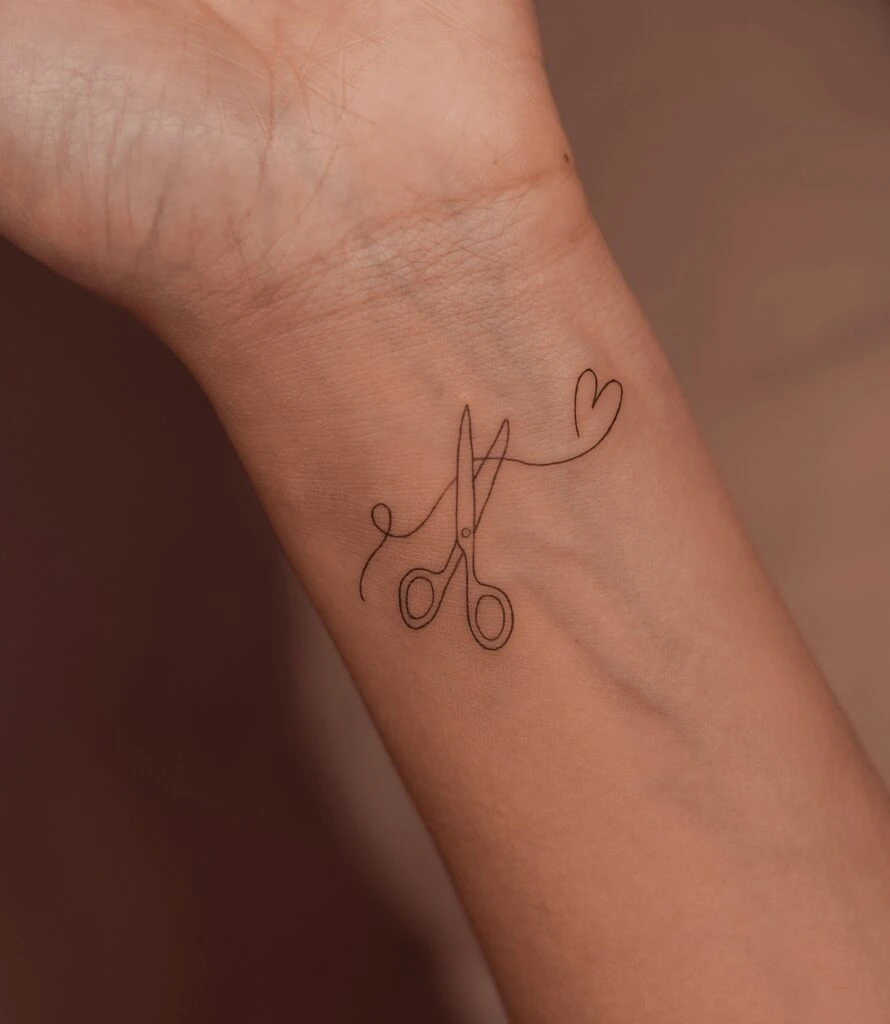 This tattoo features a pair of scissors drawn in delicate fine lines, with a flowing thread forming a heart. The continuous line design creates a seamless and artistic look, blending creativity with symbolism.